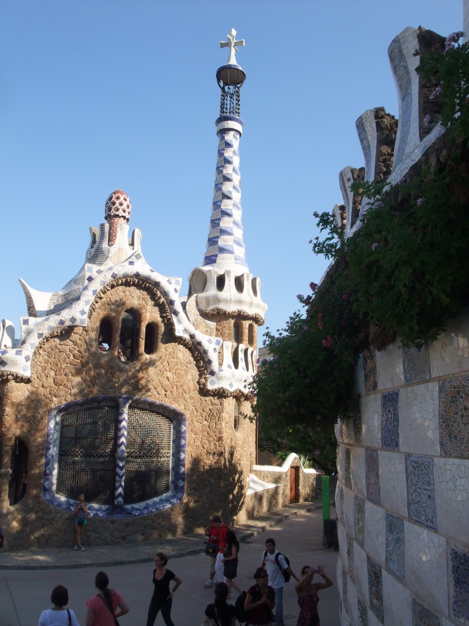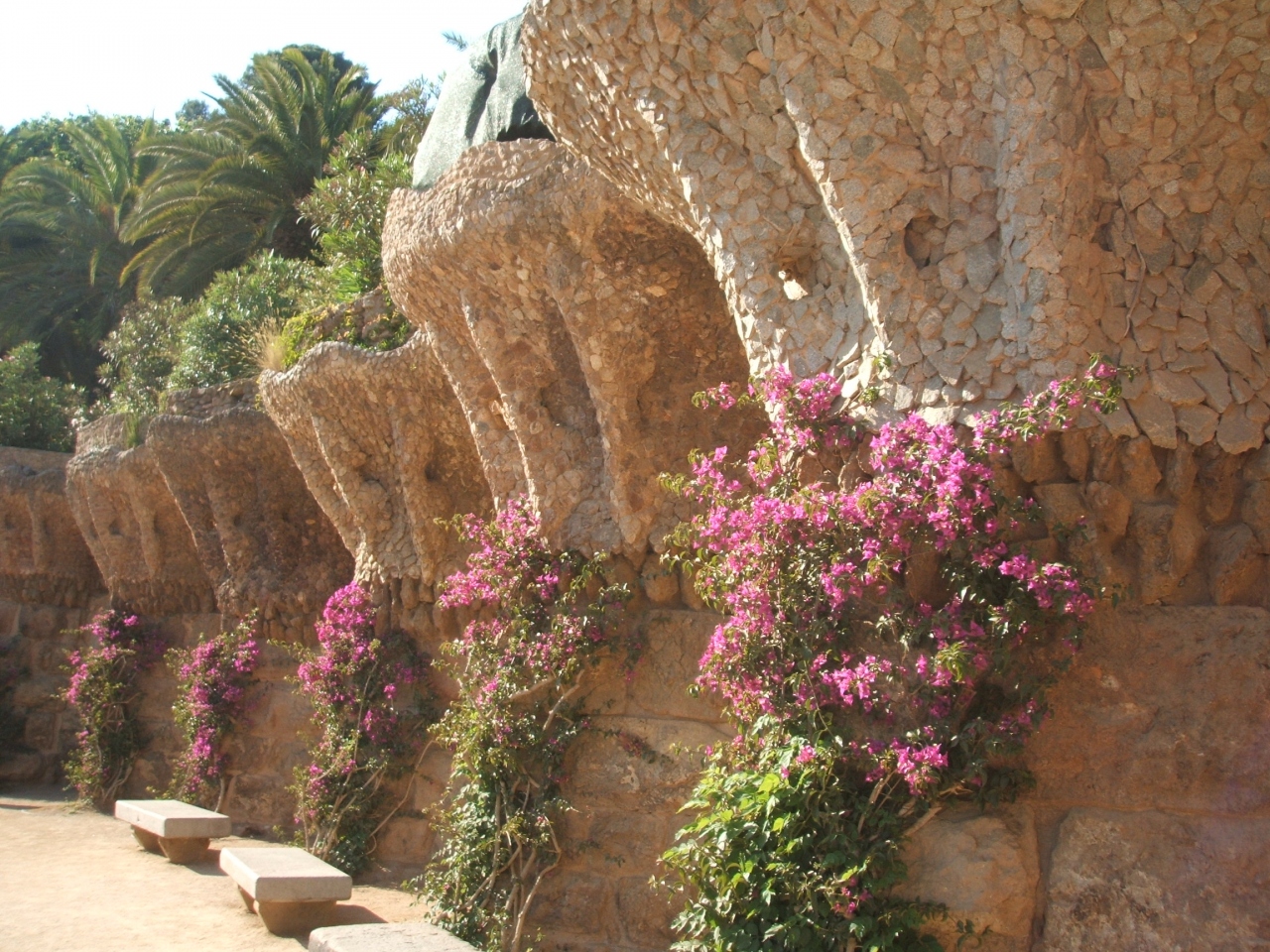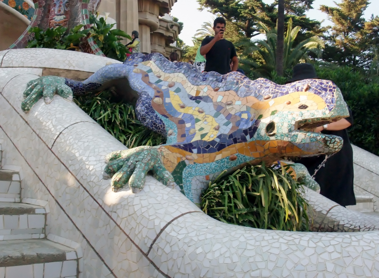 広いグエル公園の中を行けば、時折々の花々が咲き乱れ、色鮮やかな破砕タイルのベンチやトカゲの噴水などがあります。人気のトカゲの噴水の写真は、順番待ち状態です。