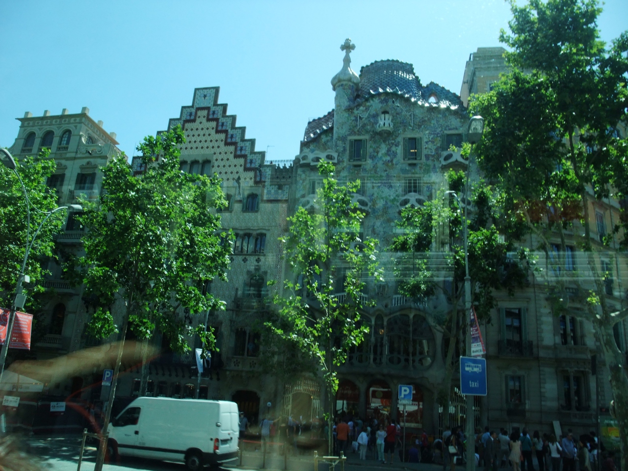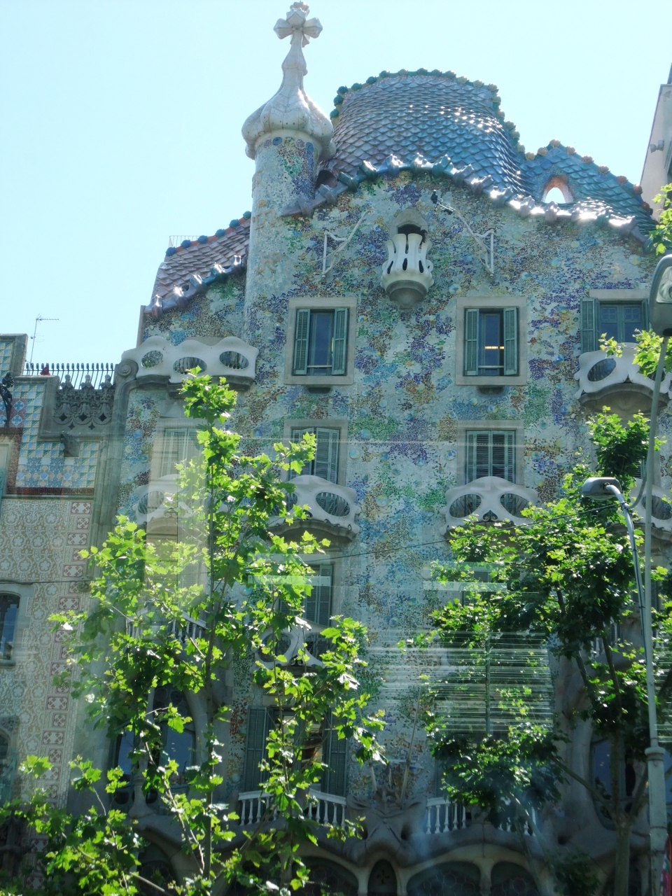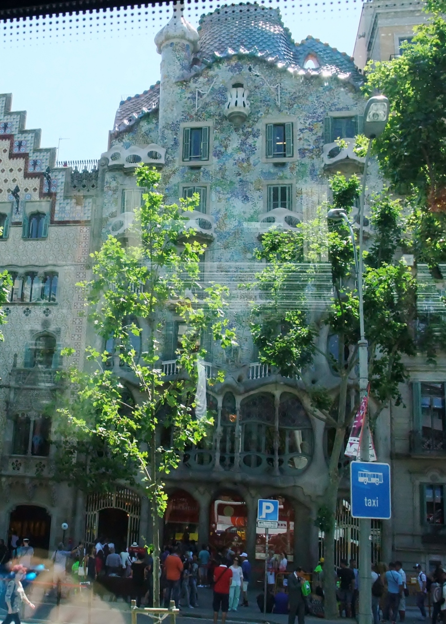 「カサ・バトリョ」(バトリョ邸)は、ガウディ後期の代表作です。1904年から1906年にかけ、 富豪バトリョ氏の依頼を受けたアントニ・ガウディが改築したもので、「カサ・バトリョ」(バトリョ邸)は、海をイメージしたと言われ、波打つような壁や波を思わせる青のタイルが特徴です。