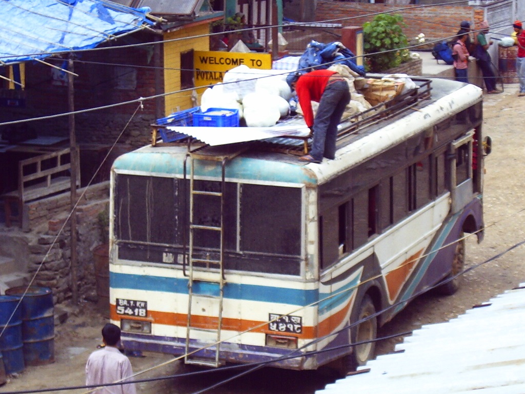 トレッキング起点の村へ行くバスは、ツアーバスでなければ、ぼろぼろのローカルバスになります。距離が遠いというよりも、客の荷物の積み下ろしや色々なことで、とても時間がかかります。また、めちゃめちゃ混んでいることが多いです。屋根の上には、荷物と一緒に人も乗ります。