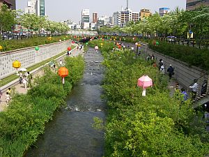 ロッテ百貨店から少し北上すると橋が見えてきて川沿いに降りることが出来ました。この川沿いに清渓2街まで1キロ弱歩きました。結構日差しがきつくて暑かったですが、水の音を聞きながら歩くのはとても気持ちがいいものでした。