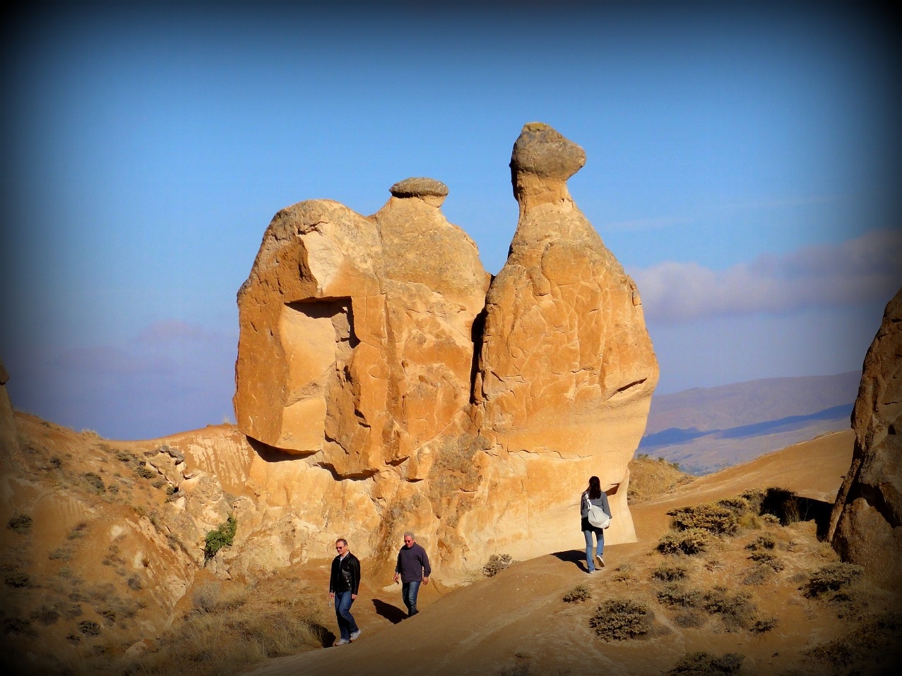 カッパドキアとは首都アンカラを中心とする中央アナトリアの地方名称。南北50?にも及び小さな村や見所が点在しています。太古の昔、火山の噴火によって堆積した溶岩や火山灰が長い年月の間に浸食されて出来た奇岩群は圧巻です。それで、こんな不思議なラクダの形をした奇岩が出来上がったのですね。自然のなせるわざに、ただただ見とれていました!!