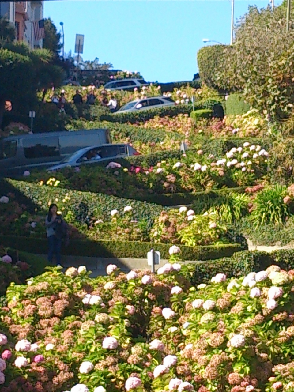 ケーブルカーでロンバートストリートで降りるとすぐです。なぜか中国人観光客がたくさん居ました。くねくねの道路は花壇で彩られていて景観もきれいです。両脇には歩道の階段があるので一番下まで降りると、くねった感が分かる写真が撮れます。