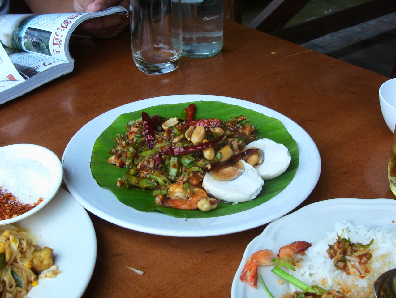タクシーの運転手に案内されて連れて行ってもらったレストランです。クウェー鉄橋の袂にあり、窓際の席からは鉄橋がよく見えます。タイ料理のお店ですが、見た目ほどには辛くはありませんでした。飲み物を含めても二人で340バーツ、1000円ほどでした。