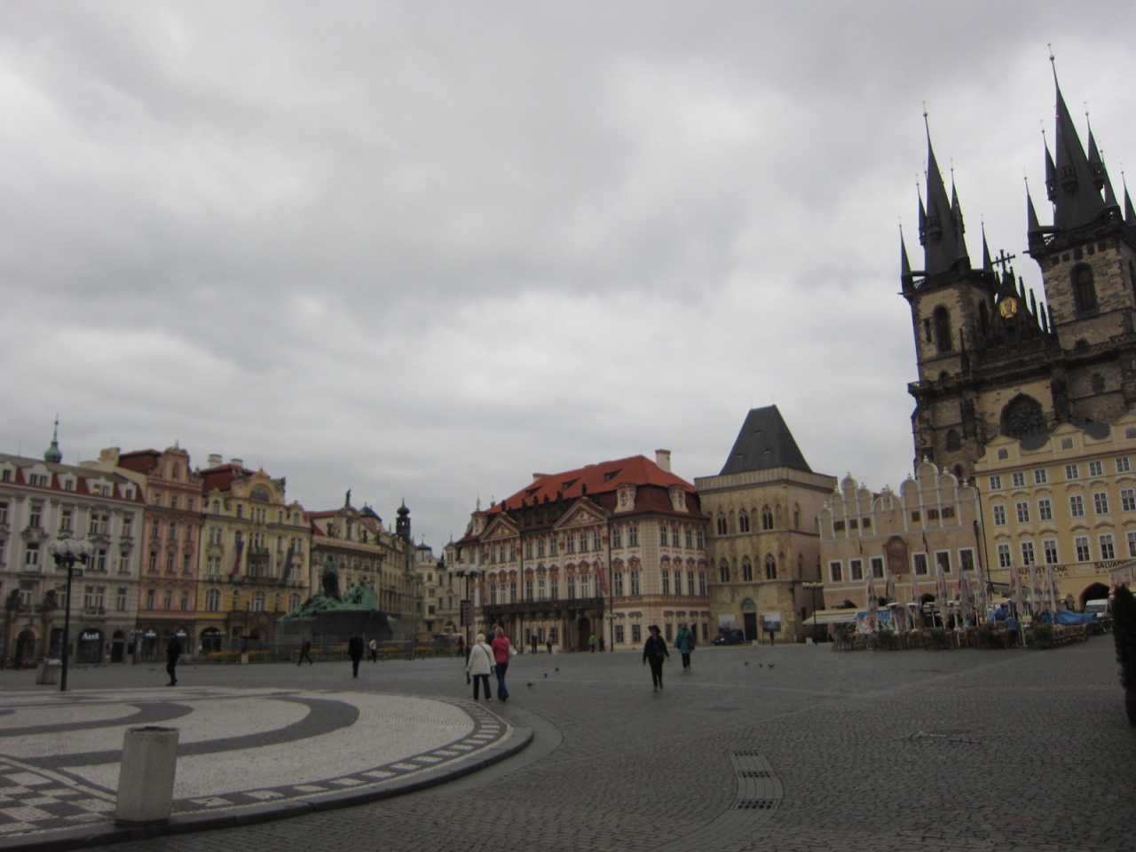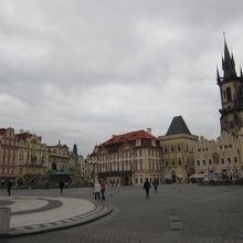 プラハの中心地。朝人が居ない時簡にいこうと思いましたが、9時前ですでに人がいました。昼間になると薪で焼いたハムの店やクレープ屋さんが出ていて、店先で食べることができます。ハム屋さんが始まると近くは煙たくなります。この広場の周囲に代表的な協会が2ヶ所あり、市庁舎などもあるので、絵になる広場です。