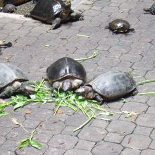 入口に着いた途端、葉っぱの束を持った、おばあさんが「かめのえさ」と寄ってきて驚きました。