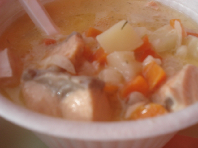 名物のサーモンスープに魚のフライをいただきました。テントでの長い時間は寒いのだけれども食べるだけならなんとかなります。