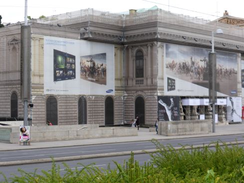交通量の多い道路向かいにあるオットウワーグナーカールスプラッツから写真を撮りました。残念なことに改装修復中で幌がされており、建物を見ることはできませんでした。
