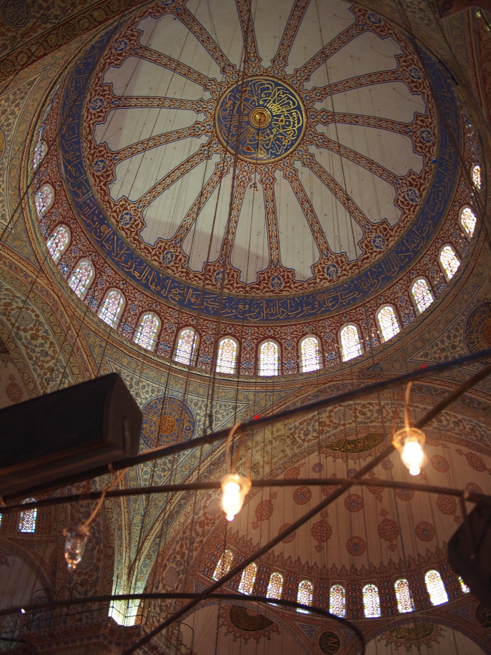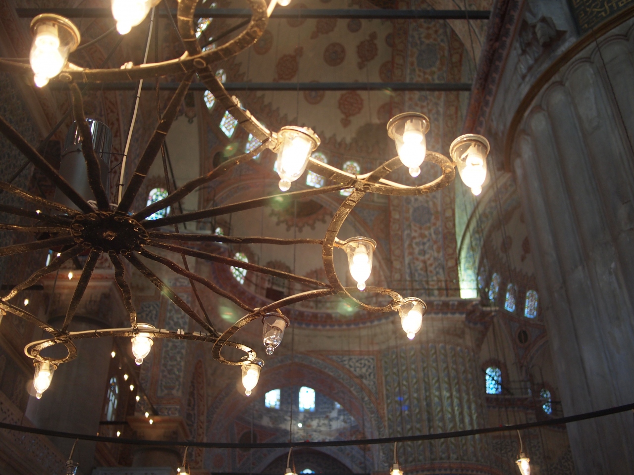 巨大なドーム、ステンドグラス、吊り下げられた電灯が印象的です。