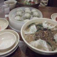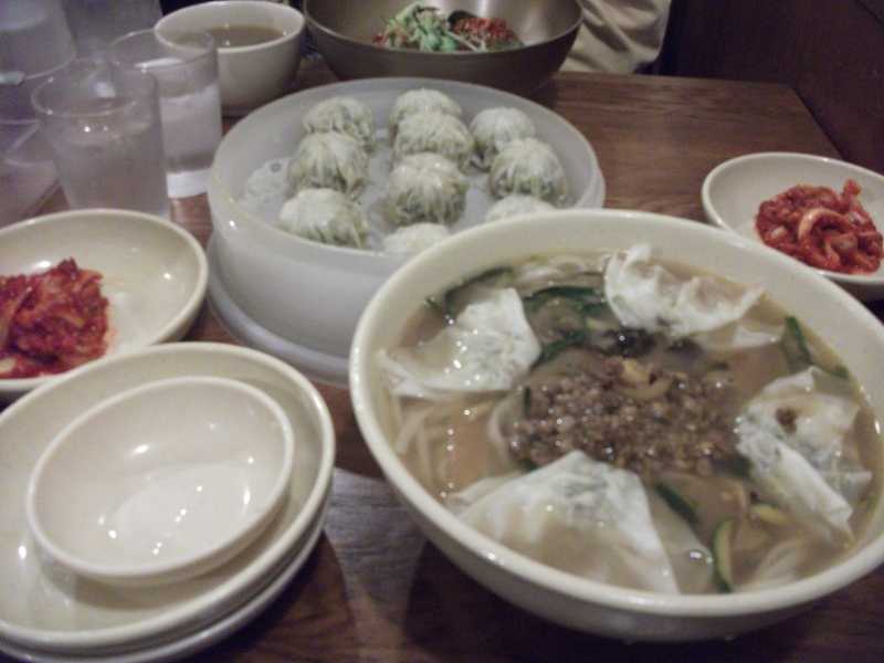 日曜日の13時過ぎで100人位の行列ができていましたが客の回転が速いので15分程で席に着けます。2人でマンドゥ、カルクッス、ビビンクッスを注文。キムチ、ごはん、カルクッスの替え玉は無料なので2~3人で1つのカルクッスをシェアしている韓国人が多いです。