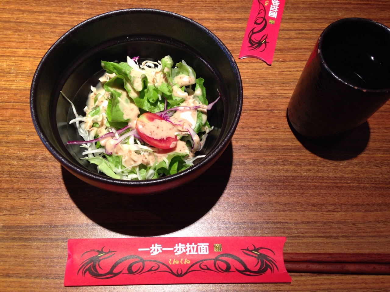 つけ麺と塩とんこつラーメンを注文したら、初めにサラダが出てきました。塩とんこつのスープはあっさりしているけどコクもあり美味しかったです。ただ麺が平打ちのつるつる麺でスープが絡まないような気がして残念。つけ麺の方は酸味の強めの魚介系とんこつスープで私は好きな味でしたが、こちらも麺が同じく平打ちのつるつるした麺。もう少し太めのちぢれ麺の方が好みかなぁ。スープが美味しかったので麺ももう少し頑張ってもらいたいです。