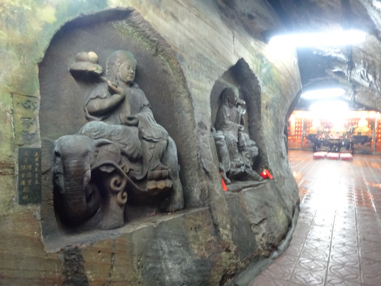 入ってすぐの洞窟に祭壇が一つ、岩壁には仏のレリーフがあり、さらに奥の洞窟に2つ目の祭壇、そしてもう一つ細長い通路を通って行った所に小さめの祭壇がありました。