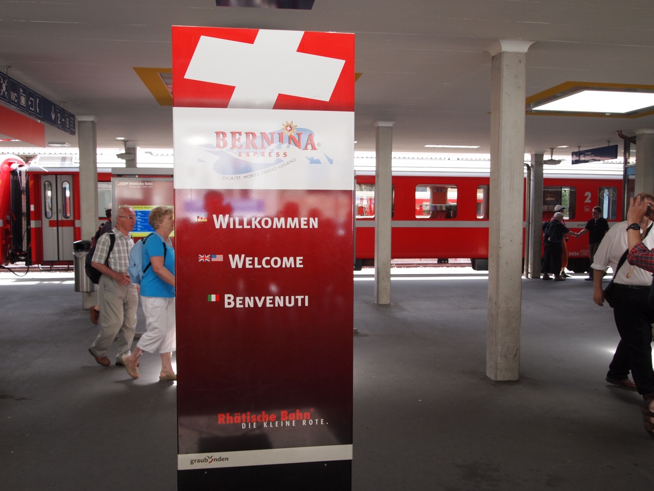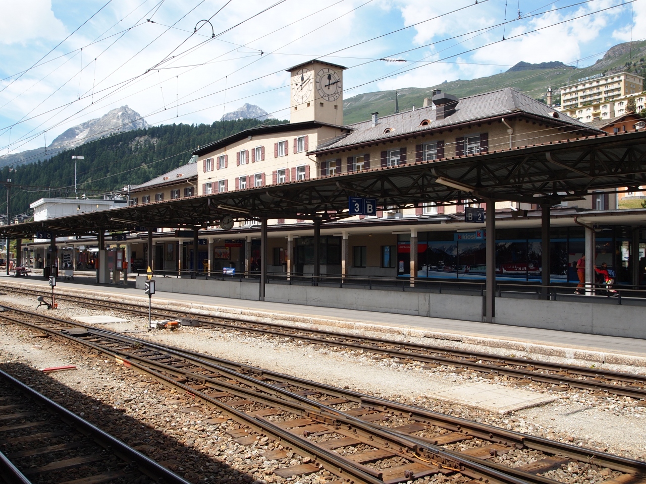 サンモリッツ駅は氷河鉄道やベルニナ鉄道などの観光客が多く利用する