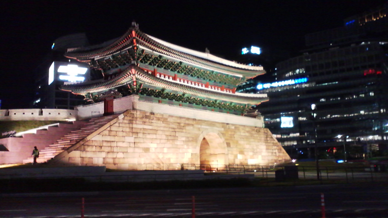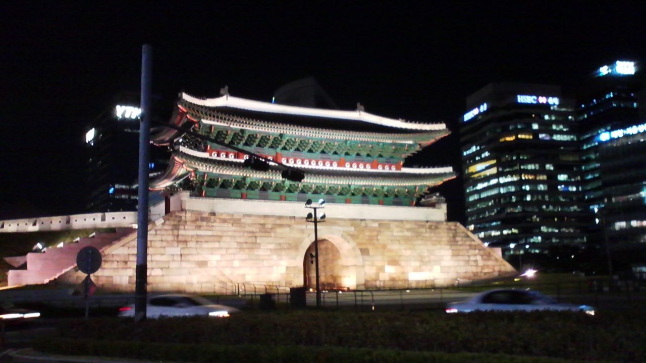 南大門市場から崇礼門まで徒歩で行けます。崇礼門は通称南大門と呼ばれているそうです。崇礼門には夕方6時までしか観覧できないので、早目に行かれることをお勧めします。到着した時間は夜の8時過ぎていたので、ライトアップされて、幻想的な美しさでした。 少し遠目でしたが、崇礼門バックに写真撮影ができて、満足できました。その周辺にはビルが立ち並び、歴史ある建物と近代ビルの調和が何とも言えない面白さがありました。 帰りには、南大門市場に立ち寄ってアジュンマの屋台で料理を楽しむのも良いです。きっと優しい笑顔で迎えてくれ、夜のソウルが満喫できます。