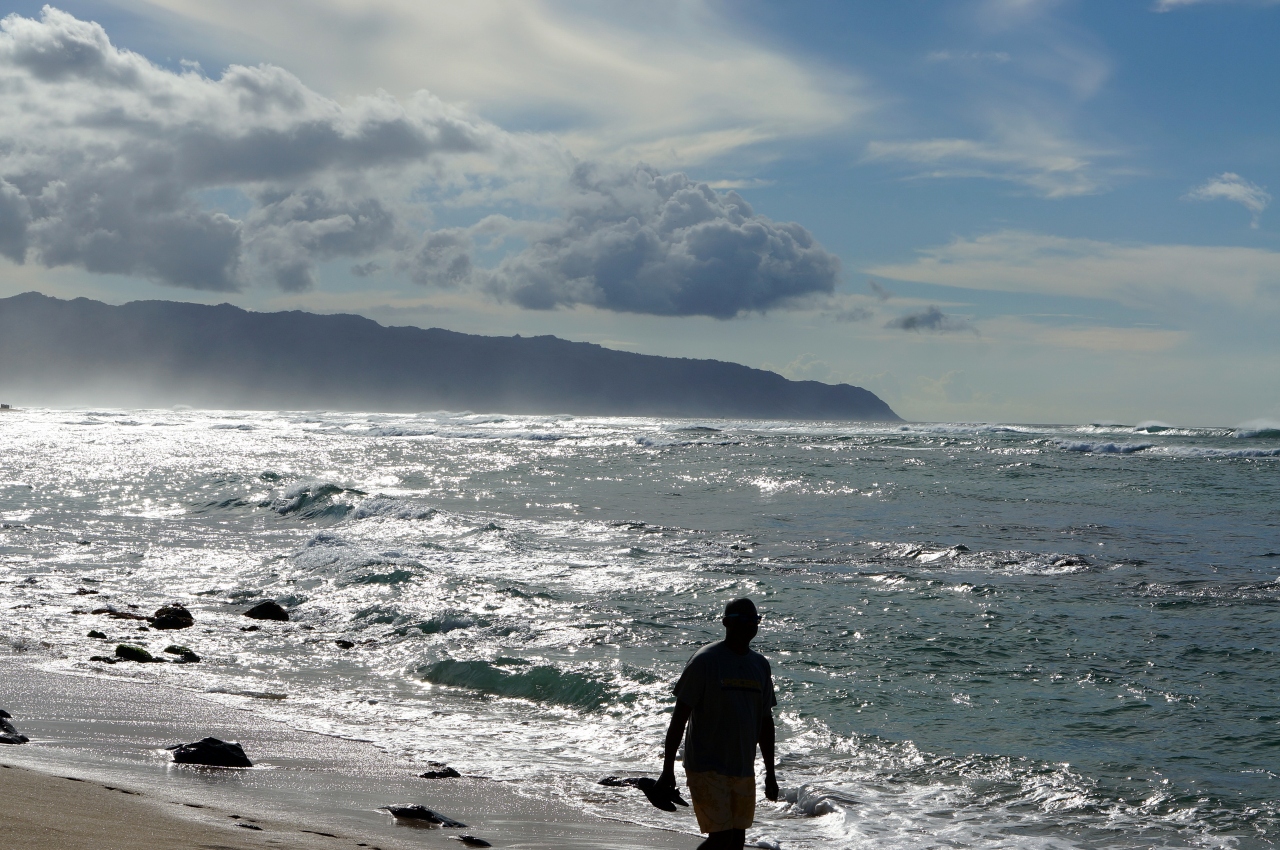 ウミガメに出会えるとの事から、行ってみました。駐車場が、道路を挟んで、ビーチの反対側なので、道路を渡る際に注意が必要です。交通量が多く、横断歩道もないので、幼児をお連れの方は、抱っこで。さて、念願のウミガメはと言うと・・・、全く動かない砂をかぶったのが1頭いるだけでした。もっと、たくさんのカメが活発に活動している事を想像していたので、残念でした。行った後に調べた所、午前中の方がいいみたいです。自分達は、夕方の16時頃だったのがダメだったのかもしれません。まあ、こういうのは自然相手ですから、仕方ないです。海自体は、荒々しくて、さすがノースショアって感じでしたので、それを観れたので来たかいがありました。