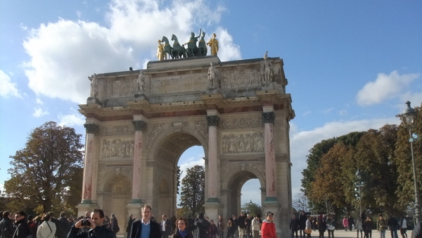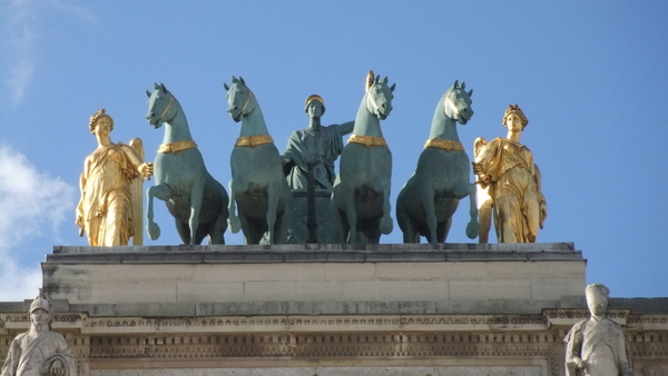 ピンクと白の大理石を基調とした小ぶりな凱旋門です。高さは約19mだそうです。有名なエトワール凱旋門の高さが約50mなので比べるとかなり小さめですがルーブル宮の西にこじんまりと位置するこの凱旋門も人気があるみたいです。今回は門の上のブロンズ像をアップで撮影してきました。