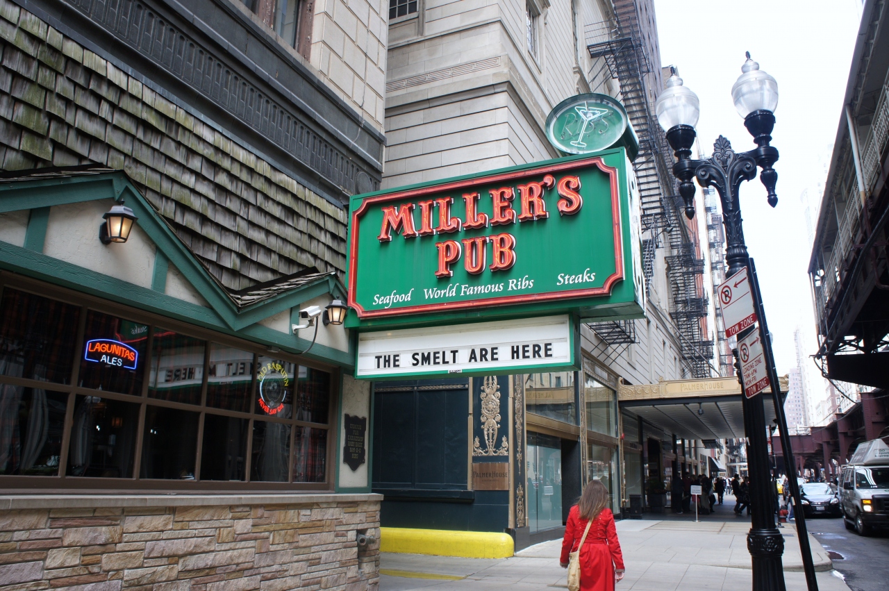 パーマー・ハウス・ヒルトンホテルのWabash St.側の出口のすぐ右側にあり、高架鉄道のアダムス駅の降り口の前にあります。