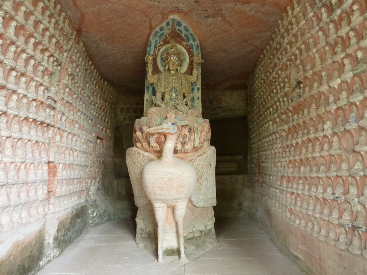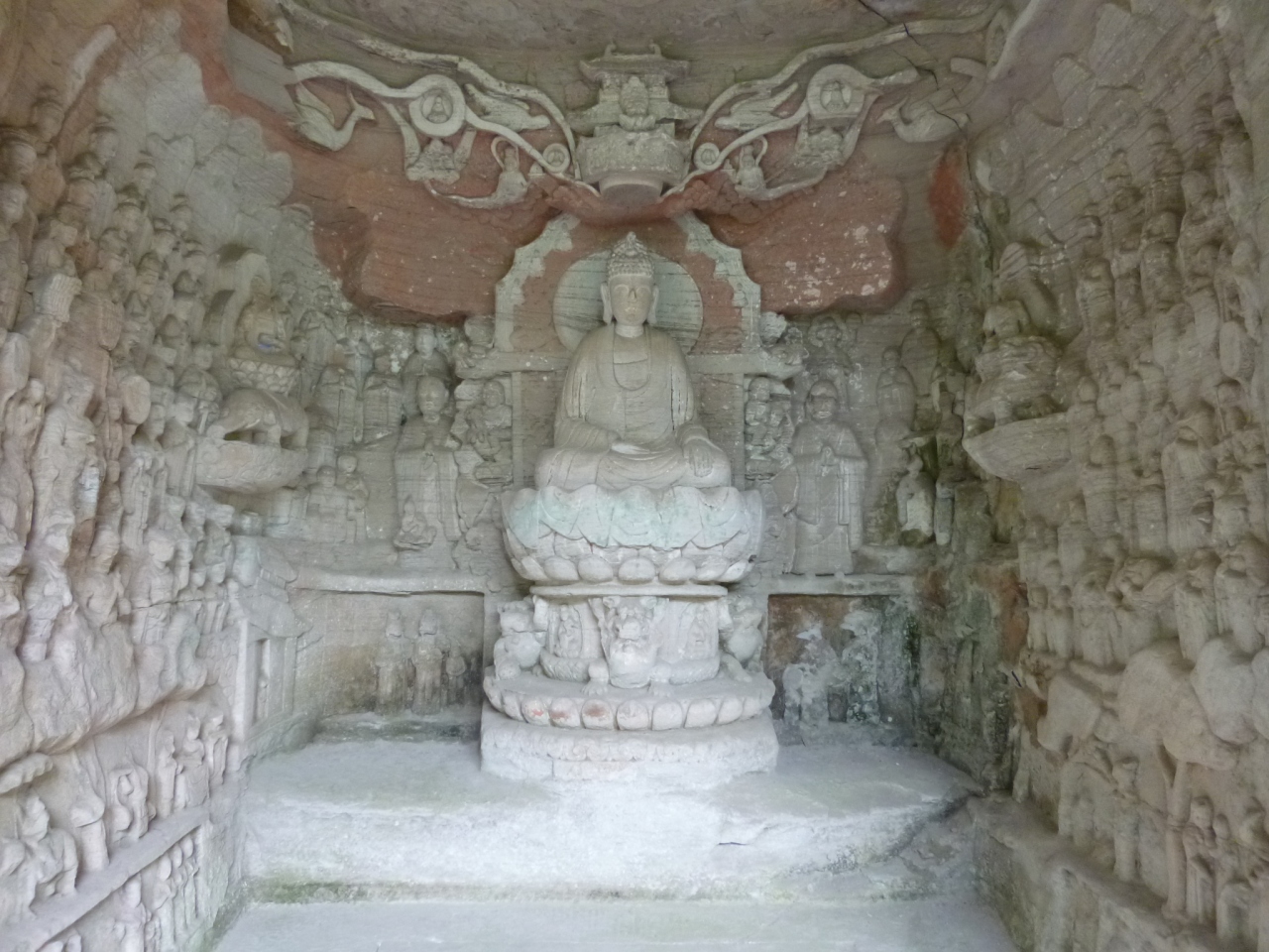 大足石窟寺院を訪問後、北山の石窟郡を訪れました。バスやタクシーの降り口から30分ほど山道を落ち葉を踏みしめながら登った先にあります。途中はひなびた遊園地などあり、なんとも言えないさみしい場所ですが、それがまた忘れさられたような古の石窟を動乱の歴史から守ってきたのかもしれません。