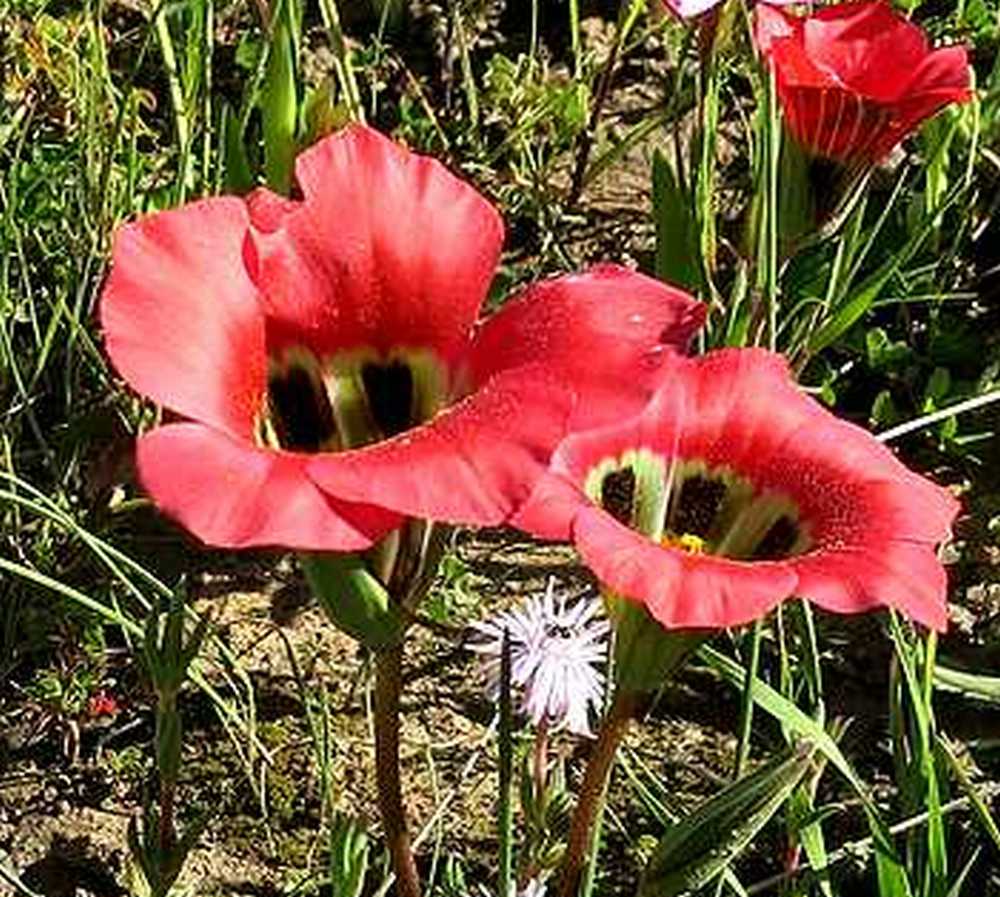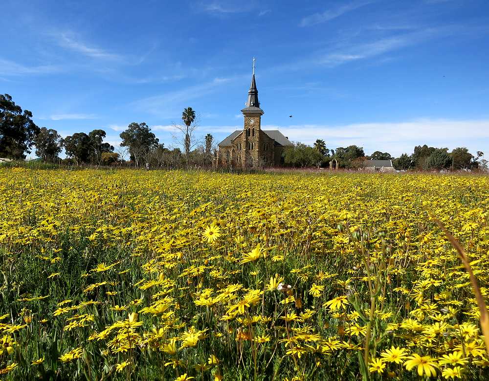 非常に難しい名前だが、原語はNieuwoudtville(筆者は最初ニューウッドビルだと思っていた)。ケープタウンとナマクアランドのほぼ中間に位置する小さな町で、ケープタウンから行くには、N7を300km程北上したVanrhynsdorp(ヴァンラインスドルプ)という町からR27を東に50km位走り、テーブルマウンテンを登り切ったところにある。その途中の景色も雄大で、いかにもアフリカらしいドライブが楽しめる。ワイルドフラワーの咲く場所は、町中の教会の敷地内にあるインフォメーションで教えてもらえる(地図もあるが有料)。日本ではほとんど知られていなくて、地球の歩き方にも載っていないが、現地のツアーではナマクアランドより時間を割く場所で、かなり有名なところらしい。花の種類もナマクアランドとはかなり違っていた。宿泊は、ニーウヴォウトヴルの中にもB&Bやゲストハウスがいくつかあるが、やはり花のシーズンはかなり混み合い、予約は困難だった。その他の宿泊地としては、ヴァンラインスドルプや、そこからN7を南に70kmほど行ったところにあるクランウィリアムが適当だろう。