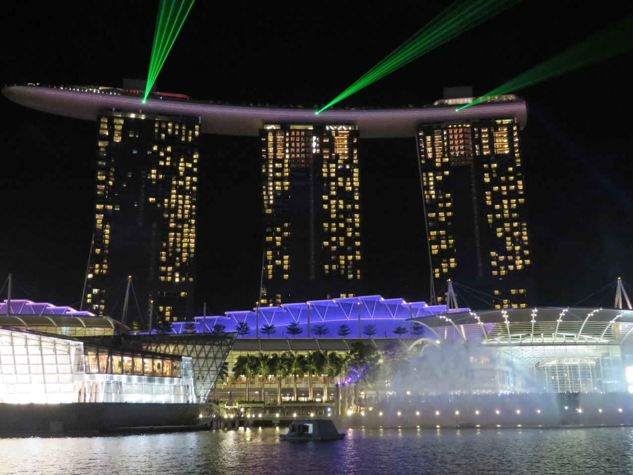 昼は泥水で決してきれいではないシンガポール側も、夜になると岸辺のお店のネオンが水に映ってきれいですし、ライトアップされたマーライオンや、派手にレーザーや電飾で彩られるマリーナベイサンズを見るのも、このクルーズが最適です。