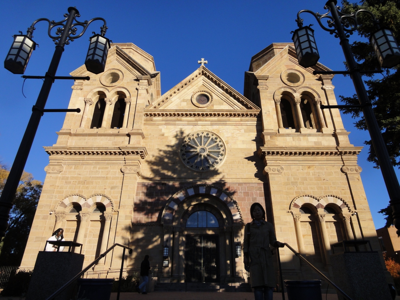 ニューメキシコ州サンタフェのダウンタウンプラザの端に位置する聖フランシス大聖堂は、正式には、Cathedral Basilica of St. Francis of Assisiと呼ばれています。ダウンタウンを道なりに歩くと目の前に立派な教会が見えてきます。それがこの教会です。イタリアのフランシスコ派の教会で、ロマネスク様式と言うのでしょうか、このあたりに多く見られるアドビ様式の教会とは全く異なる荘厳な外観と内部です。ミサをやっていなければ、無料で(献金は求められる)中にも入れるので、サンタフェの他の教会と比べて見るのもおもしろいかもしれません。