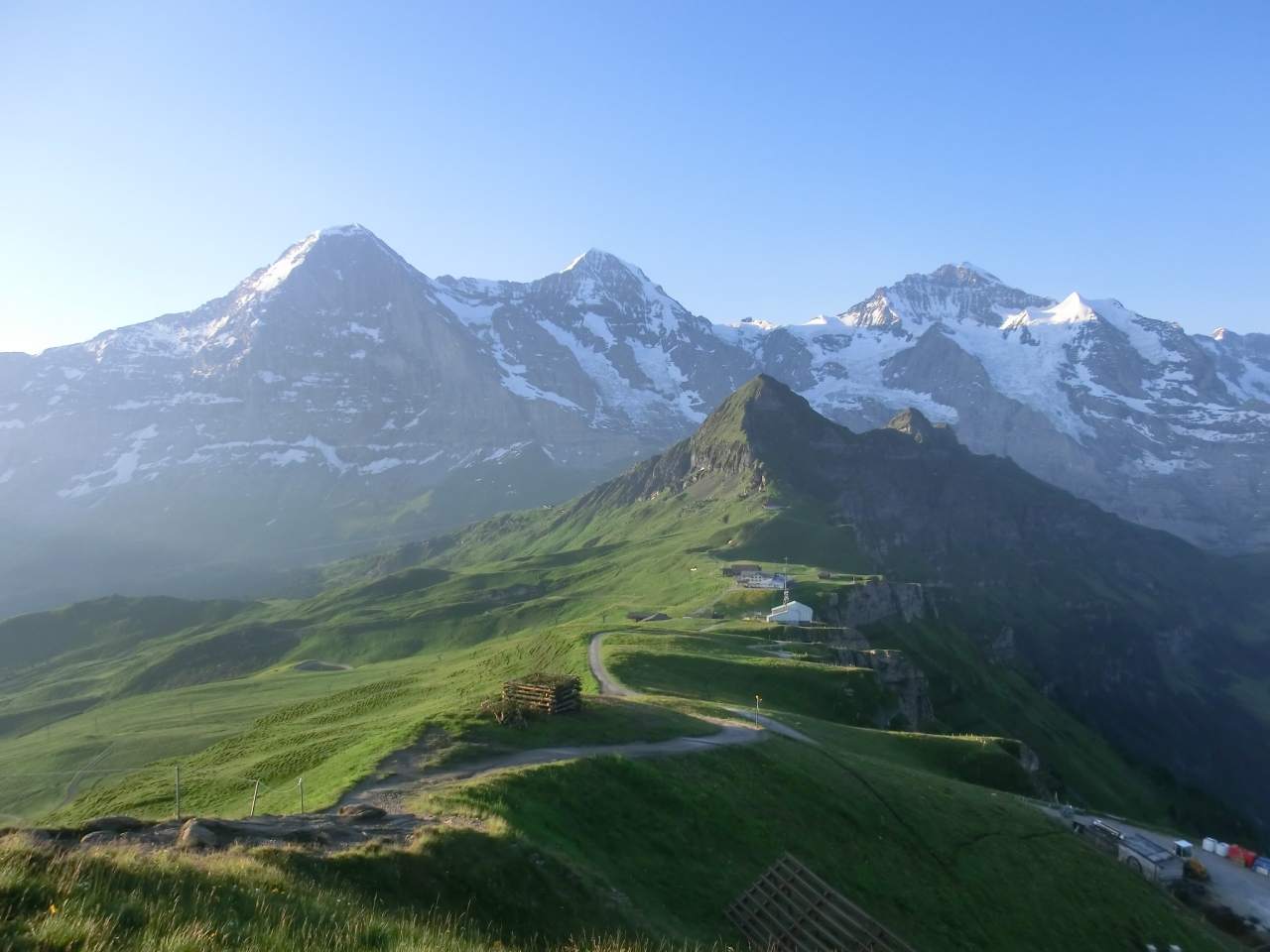 メンリッヒェンのホテルに宿泊し、朝一番で頂上に登りました。ちょっと裏山へ、という感じです。朝日に輝くお花畑の散歩は楽しくて楽しくて!頂上付近からはヴェンゲンの街並みが見下ろせ、高度を感じさせます。もちろんアイガー・メンヒ・ユングフラウの勇姿は素晴らしかったです。