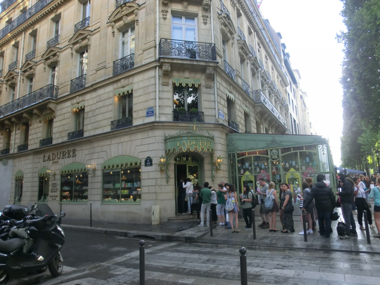 大勢の観光客でにぎわっていますが、歩道が広く、散歩道としては華やかで気持ちよかったです。ヴィトン本店は朝一番で訪れたので、すんなり入れましたが、午後、預かってもらった荷物を取りに行くと噂の入場制限がかかっていてびっくりしました。ラデュレも大勢の人が並んでいたし、マックもモノプリのレジもけっこう並びました。