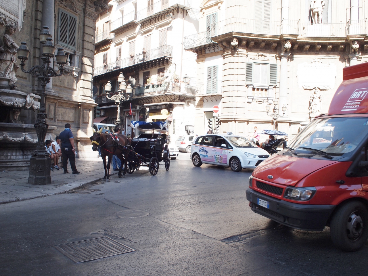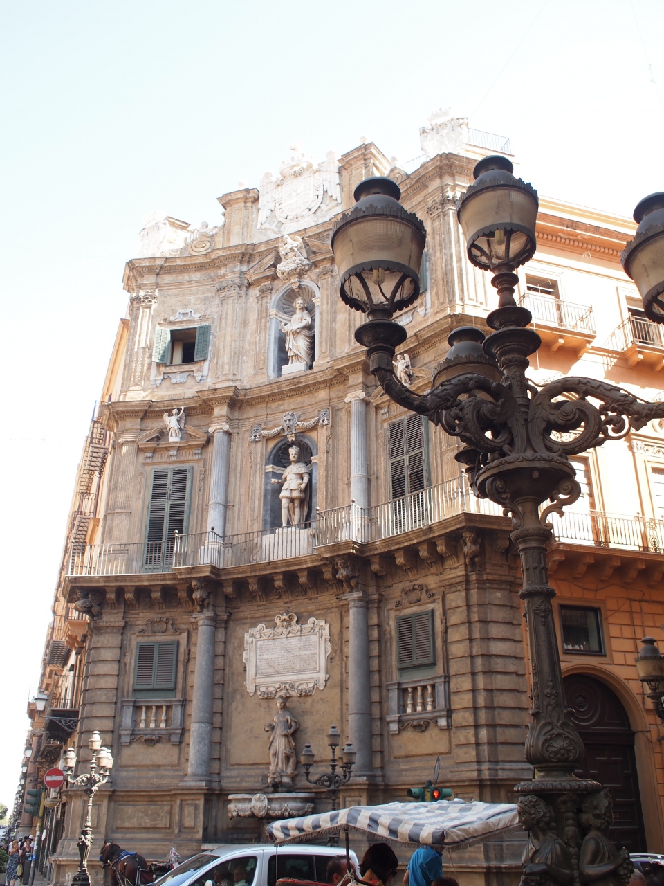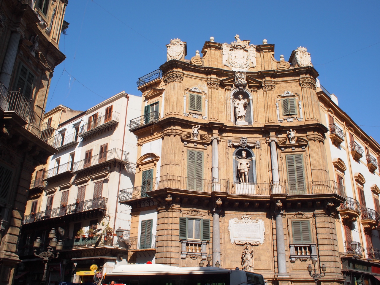 とても美しい四つ辻で、交差点に面する4つの建物は弧を描いており、そこに1段目には季節を象徴する噴水、2段目には歴代スペイン総督、3段目には街の守護聖女が彫られています。スペイン総督らによる都市計画の一環だそうですが、日本では余り見ません。とても珍しく思いました。