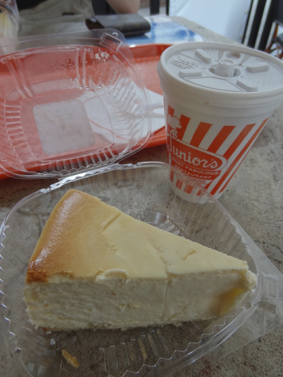 ニューヨークに来たら、ニューヨーク・チーズケーキということで老舗のJunior'sへ。テイクアウトにして、店の前にあるテーブルで食べました。濃厚だけど甘すぎず、とても美味しいですが、一人で一つ食べるのはキツイかも。二人で一つ位でいいかもしれません。