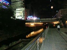 東大門市場周辺で夕食を食べ、帰る途中に川がありましたので、川岸まで降りてしばらく歩きました。川沿いも非常に整備されていてとても歩きやすかったですし、川岸から見上げる両岸のビルのネオンなどもとても綺麗でした。ランニングをしている人もいましたが、ブラブラ散歩するにも打って付けの場所だと思います。