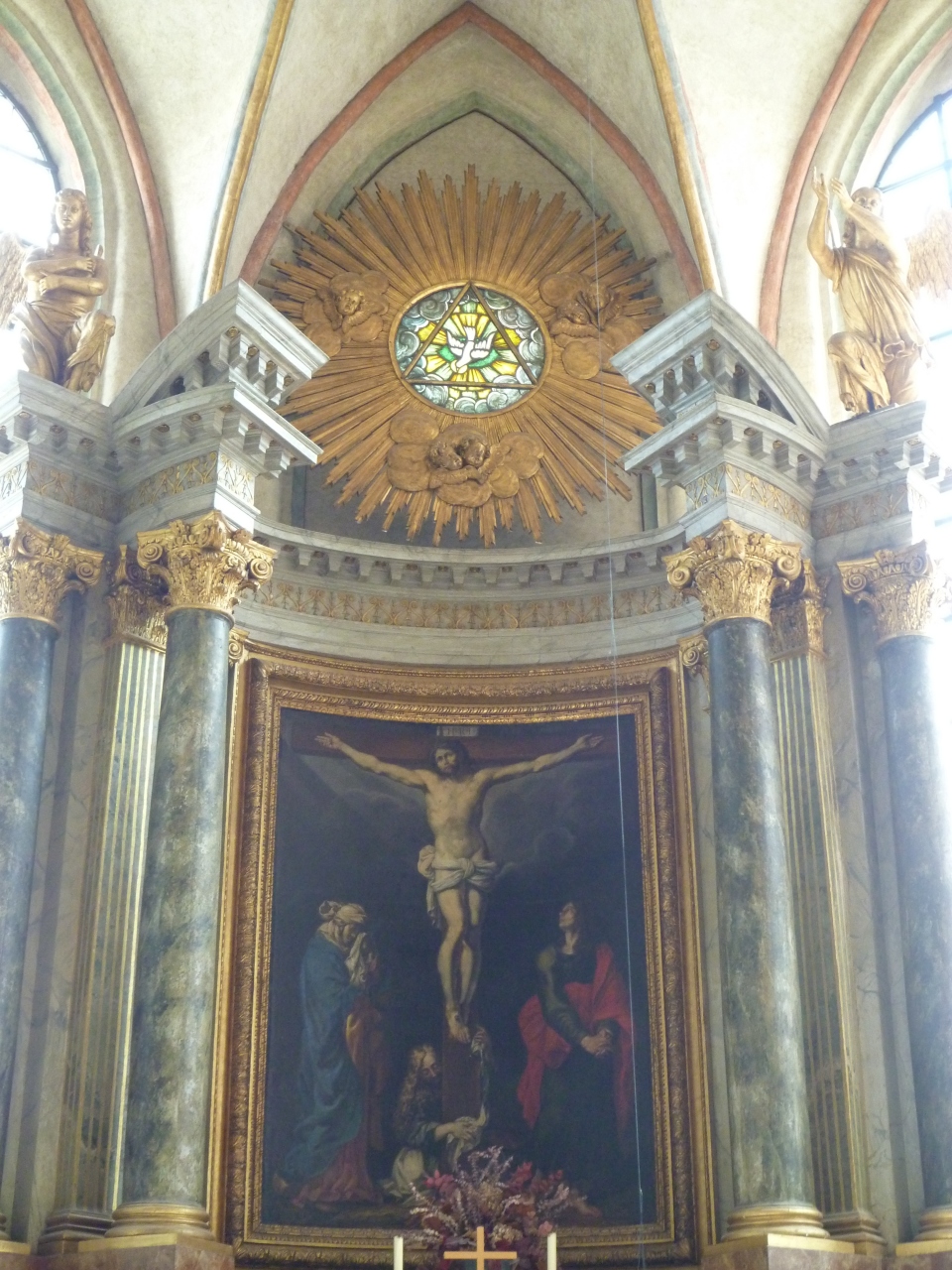 王族や貴族の紋章が所狭しと飾られている教会でした。外観の特徴的な尖塔も素敵です。