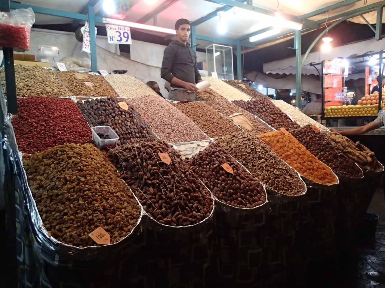 日没とともに賑やかになるフナ広場。常設の商店も露店も一体になって雰囲気を盛り上げる感じです。ツアーでの観光だったので、時間があまり無かったのが残念ですが、屋台の生搾りのオレンジジュース(4DH 約50円)はとっても美味しかったです。