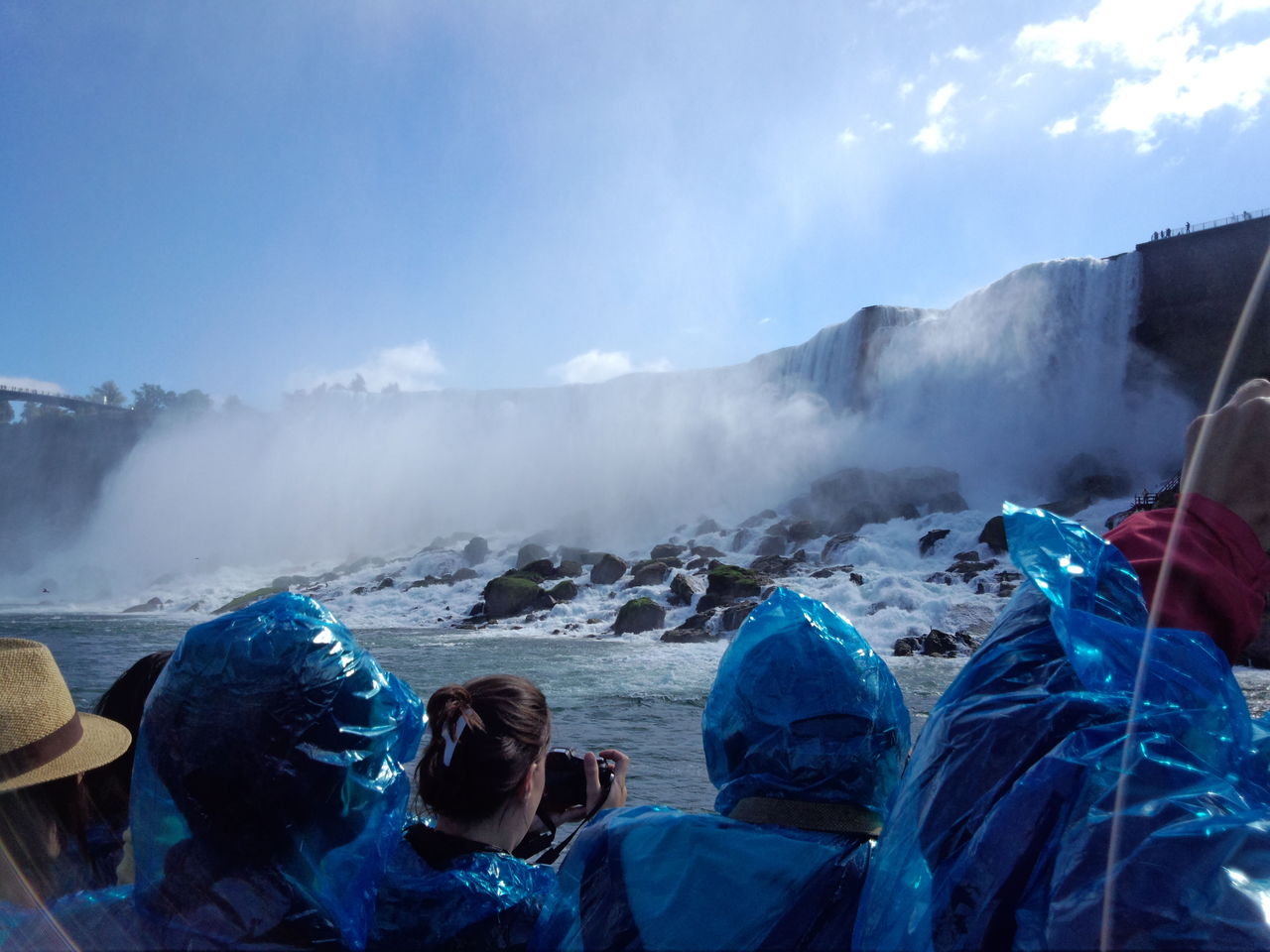 ナイアガラの定番とも言える霧の乙女号。シーズン中しか営業していませんのでナイアガラ旅行を考えていて是非とも乗りたい方はシーズン中を狙った旅行計画を立てて下さい。大きな船でナイアガラの滝を周遊するのですが、ポジション取りによっては中々見えずらい事になるパターンもありますので、乗船する前にある程度列の並びを見て次の船に乗れるタイミングの時に順番待ちの列の前の方をキープしていればベストポジションで船に乗る事が出来ると思います。その代わりベストポジション、イコールかなり濡れますので覚悟は必要です。一応カッパは貰えます。アメリカ滝からカナダ滝まで周遊し戻る感じですが、凡そ20分ぐらいだと思います。ナイアガラ・フォールズは他にもアトラクションがありますのでアメリカ側に渡って風の洞窟に行くのもオススメです。乗船する前に写真撮影されますが、売店で買う事が出来ます。確か高かった。(笑)たぶん1枚15カナダドルだったかな?勿論2枚買ってしまった。