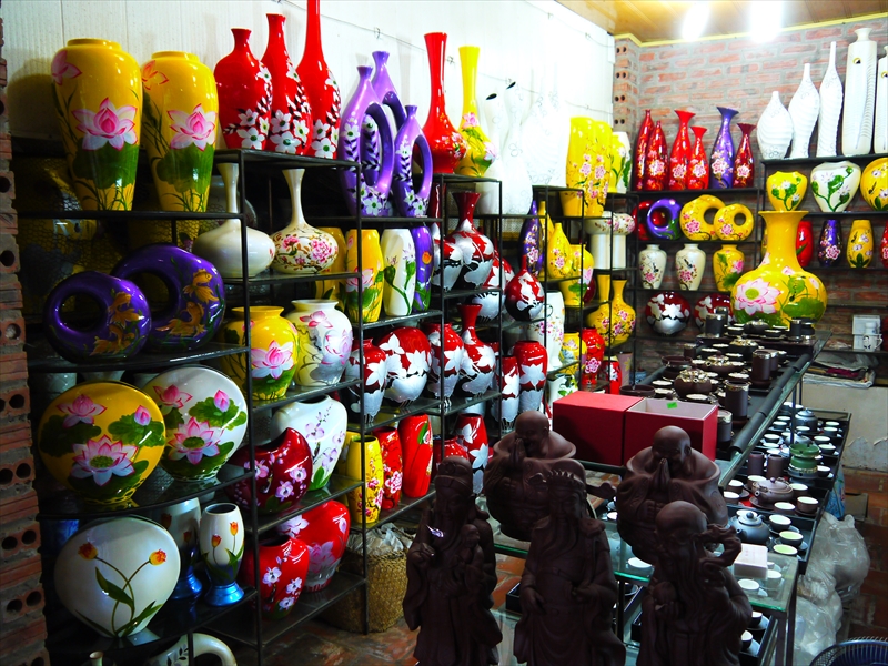 ロンビエンバスターミナルから47番バスで簡単にたどり着けます。終点まで乗っていればいいので気を使うこともありません。5千ドンでした。バス停から200mほど歩くと焼き物の集合展示場があり、その先に北東方向にジグザグにメインロードが続いています。