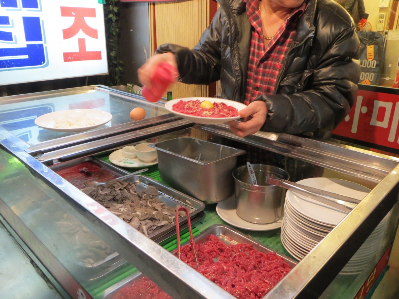 付近一帯が生肉を出すお店のようで、通路に並べられたショーケースにユッケやら内臓系やらが見えます。感じ方は「美味しそう」、もしくは「グロテスク」、いずれかだと(笑)