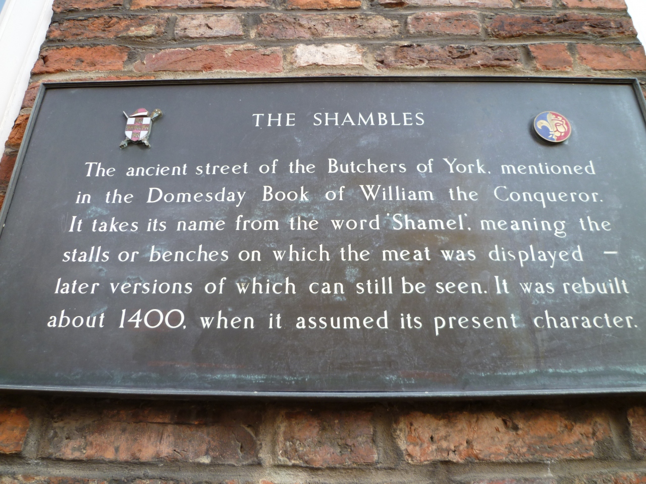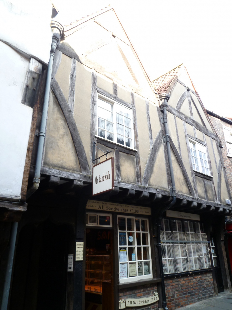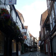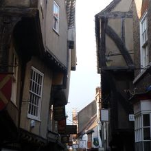 ヨークを代表する、最も有名な中世から存在する通りです。道の両側には、ティンバー・フレームド造りという、木骨と土壁でできた建物がならんでいます。これらの建物の多くは14、5世紀に建てられたもので、上の階ほど外側にせり出した造りになっています。