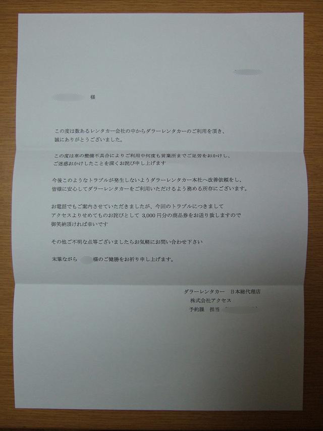 帰国後、ダラーからお詫びの手紙と金券3,000円のお詫びが来た。