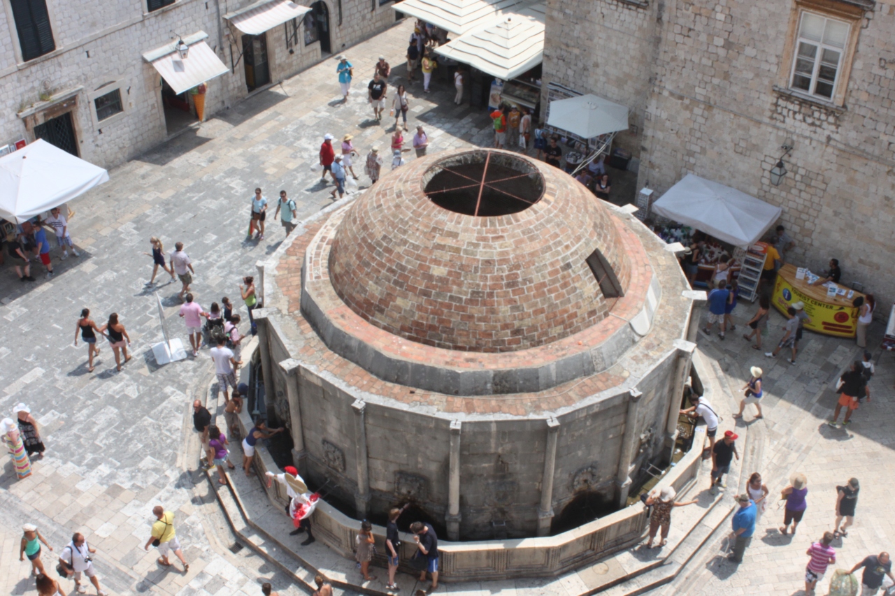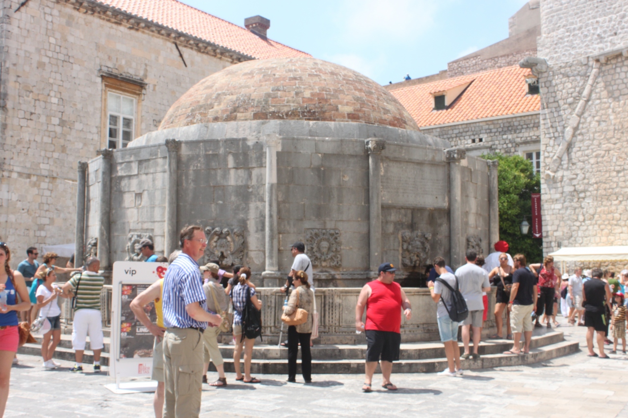 ピレ門から旧市街に入ったら、すぐです。ドーム型をしていて、蛇口のようなところから水が出ているので、大噴水という感じではないです。城壁から見たシルエットもなかなかよいです、観光客がボトルをもって水分補給をしていました。