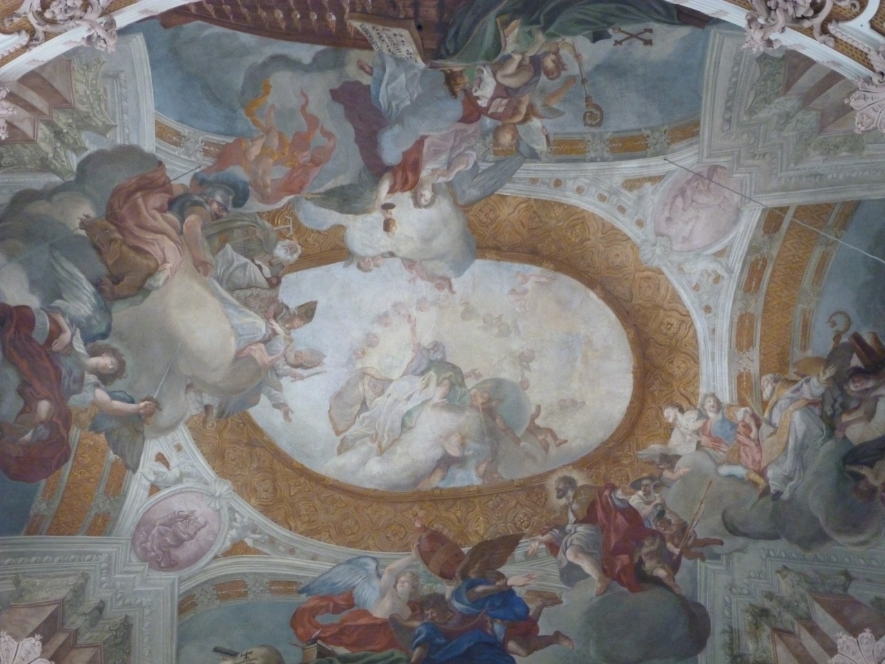 大聖堂の内部は、鮮やかなフレスコ画と植物をモチーフにした化粧漆喰(スタッコ)で装飾されています。天井のフレスコ画はとても色鮮やかで、すっと上を見上げていて首が痛くなるほどです。