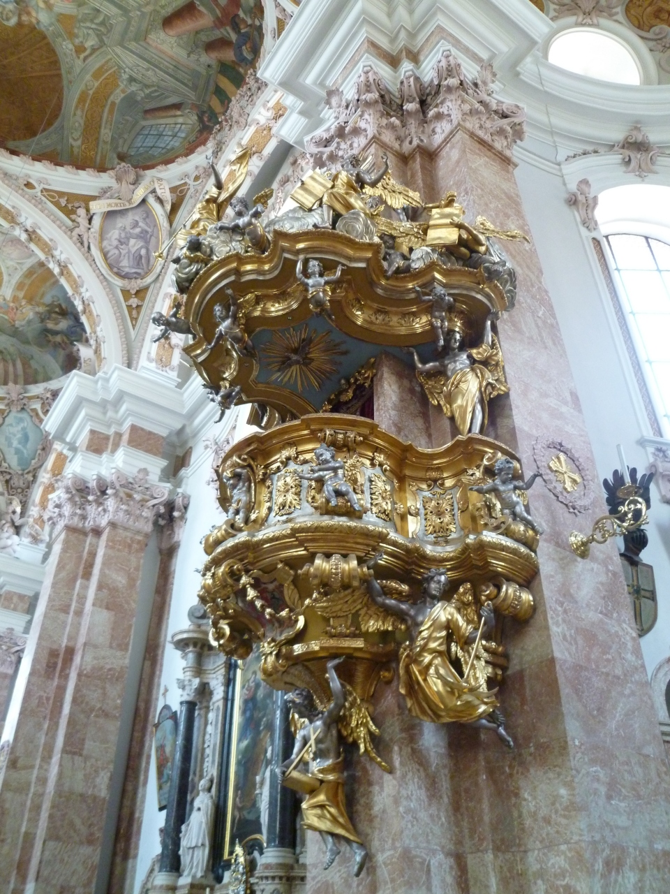 天使やプッティ(童子)の装飾が施された豪華な説教壇は、1725年にニコラウス・モルが製作したもの。大聖堂の入口上部にあるオルガンの装飾もニコラウス・モルの作品。