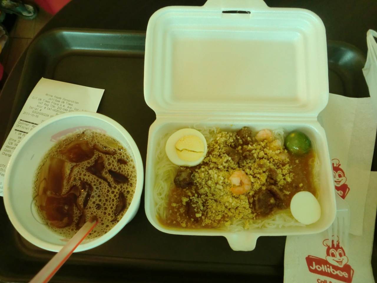 フィリピンの伝統的な食べ物であるパラボックを注文。麺でおいしかった。ジョリビーはフランチャイズのファストフード。