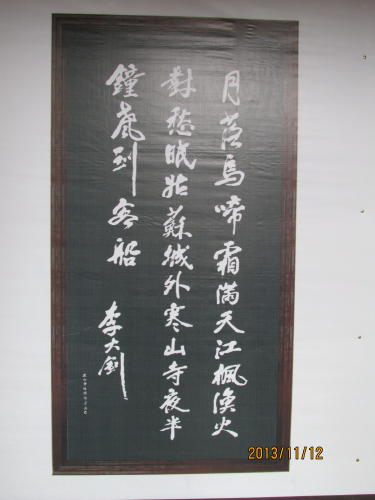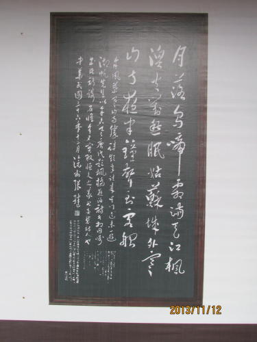 寒山寺へ、一つを舘山寺へ贈った。現在舘山寺にその鐘はないが、寒山寺には現存している。寒山寺の除夜の鐘の音を聞くと10歳若返るご利益があると言われてます。右を見ても左を見ても漢詩の「楓橋夜泊」でいっぱいです。