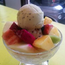 かき氷の上にいろんなフルーツがのり、その上にフルーツのアイスがのってるものを注文。