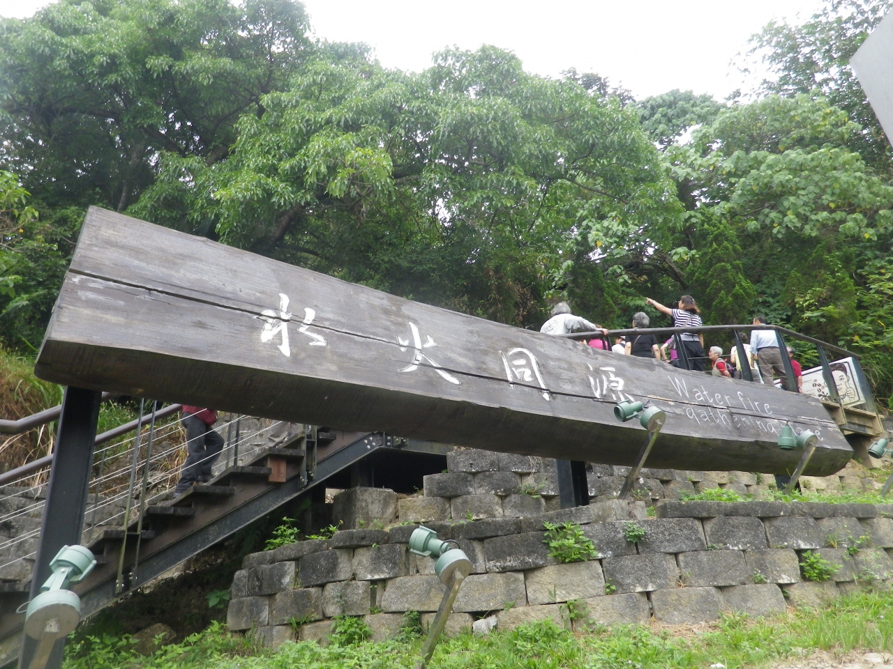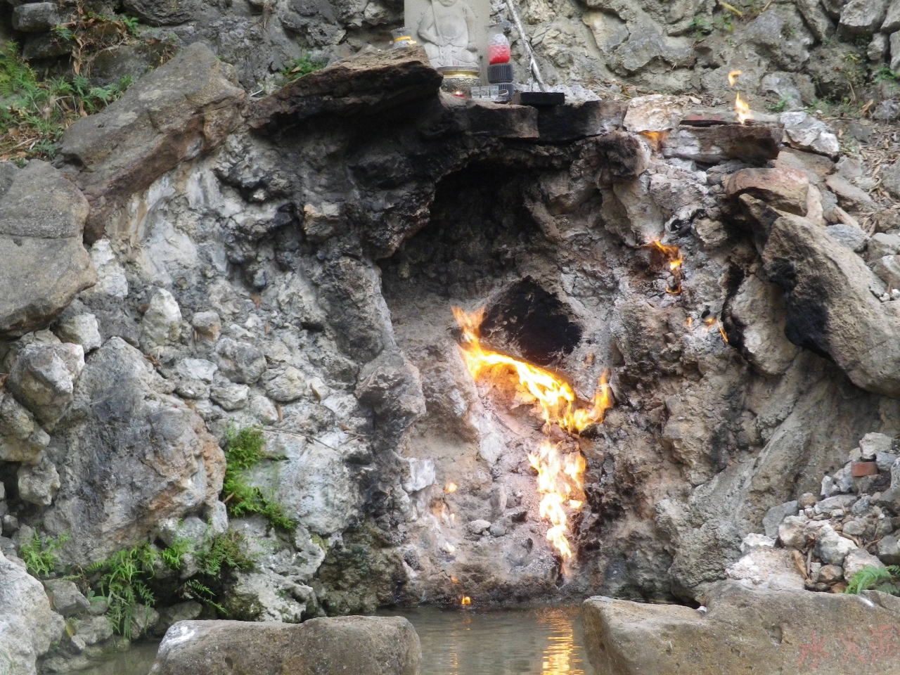 関子嶺温泉の温泉街からちょっと山へ入った場所の公園内にあります、麓にある大型駐車場から遊歩道を登るとあります、周辺は公園になっていて、お土産屋街もあります、水火同源はガスと湯が同時に噴出していて火・炎が年中見ることが出来ます、そのものの規模は小さいが珍しいので一見の価値ありです。