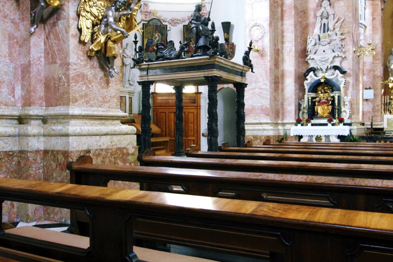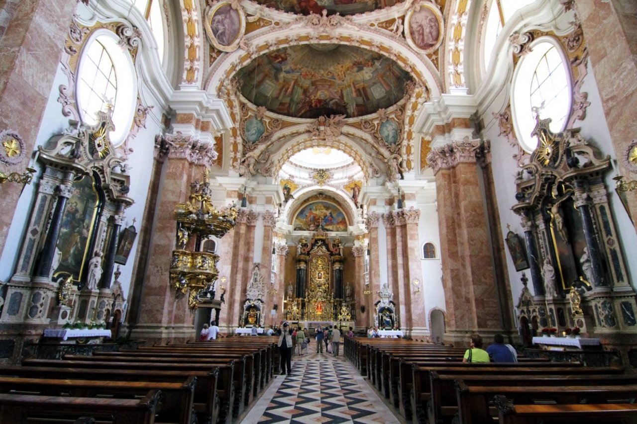 きれいな街インスブルックの中心広場から歩いてすぐにあります。外観は堂々として風格のある大聖堂の趣きです。中はというと、まずは豪華で綺麗です。よく見ると色合いや装飾など、他の都市で見た教会に比べて断然華やかでかわいい、という印象です。パイプオルガンの装飾も超豪華ですね。
