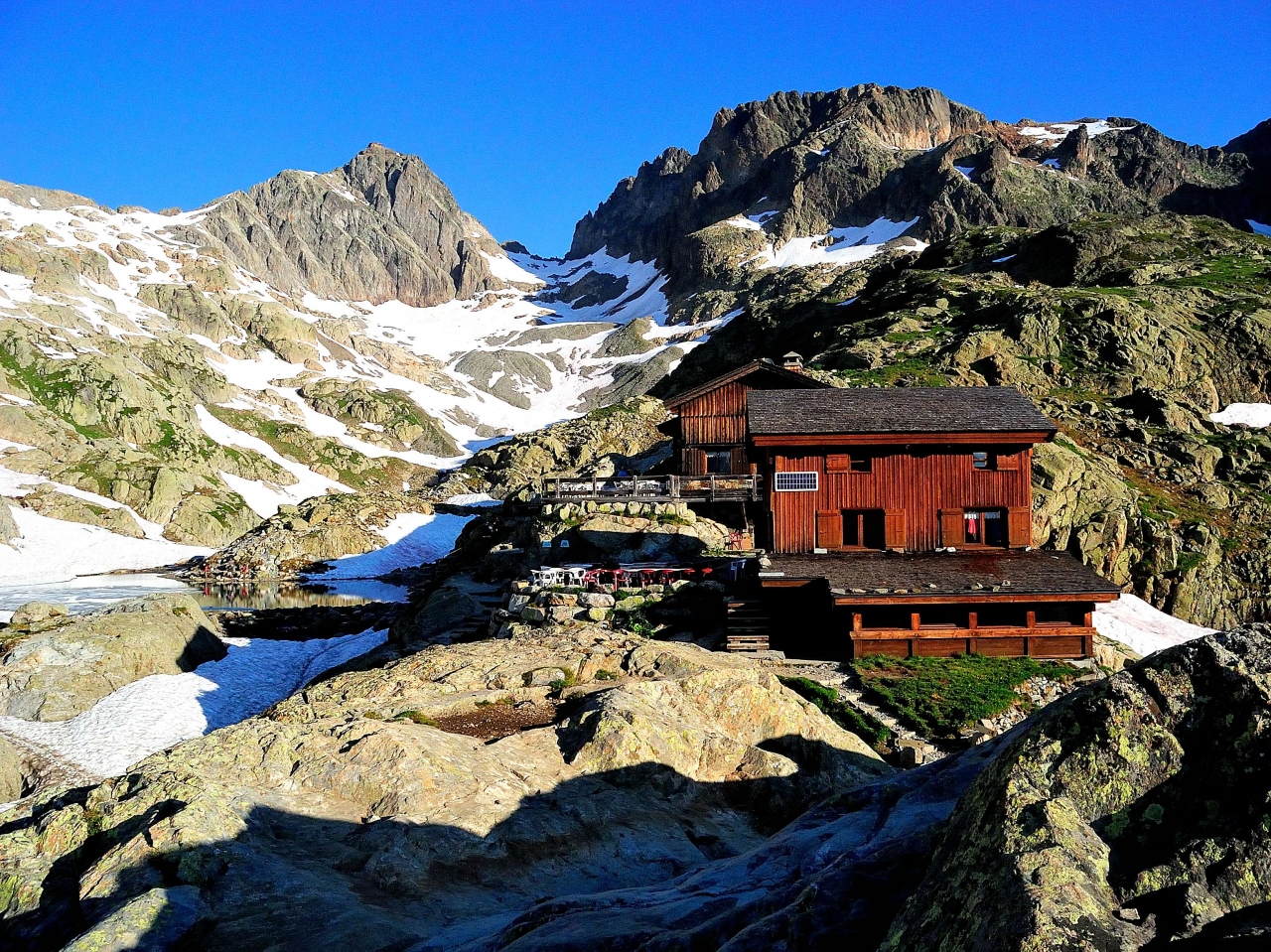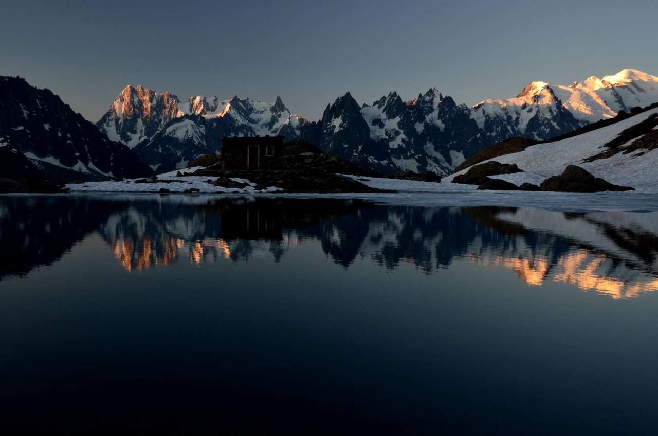 町からリフト乗り場まで徒歩30分、リフトを降りてから、高山植物を見ながら徒歩2時間半の距離です。モンブランやシャモニー針峰群の景観を眺めながらの快適な登山道です。一部はツールド・モンブランのハイキングコースとなっています。フランス語でラックとは湖、ブランとは白のことです。ラック・ブラン小屋で一泊しました。夕方、アインベックが小屋近くまで寄ってきました。5~6頭の群れで一家のようです。テレビでは見たことがありますが、現物に対面するのは初めてで興奮しました。翌朝、湖越しに見るモンブランやグランドジョラスは素晴らしかったです。