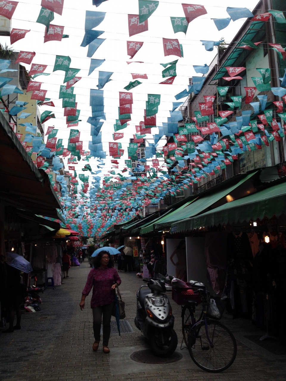 松江南京駅から少し北側(行天宮寄り)へ歩いて右に曲がった辺りに四平陽光商圏とよばれる通りがあります。この辺り一帯が四平街というようですが、ここの通りは衣料品、それもほとんどが女性向けの衣料品を扱っている商店が連なっています。通りの上にはカラフルな紙?がヒラヒラとたなびいており、とても綺麗です。