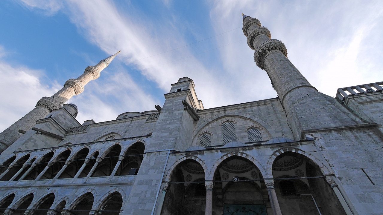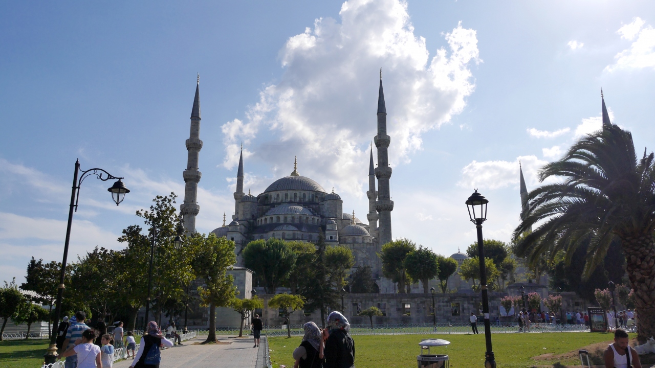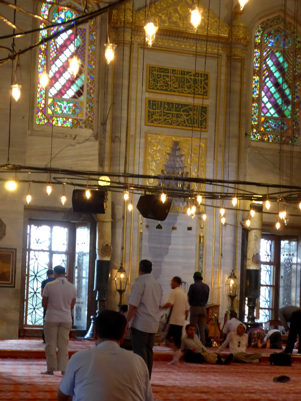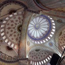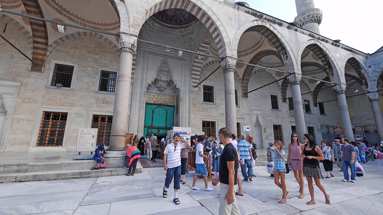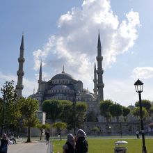 ブルーモスク,スルタンアメフットジャーミーは礼拝時間 中が見学禁止になるが,中庭でその時間は表示される.イスラム教の礼拝時間は日の出,日の入りなどで変わるのでとりあえず,この中庭まで来て見学時間なら見学,見学禁止時間なら先にアヤソフィアやスルタン廟,Hipodromeなどを見学してくるとよい.