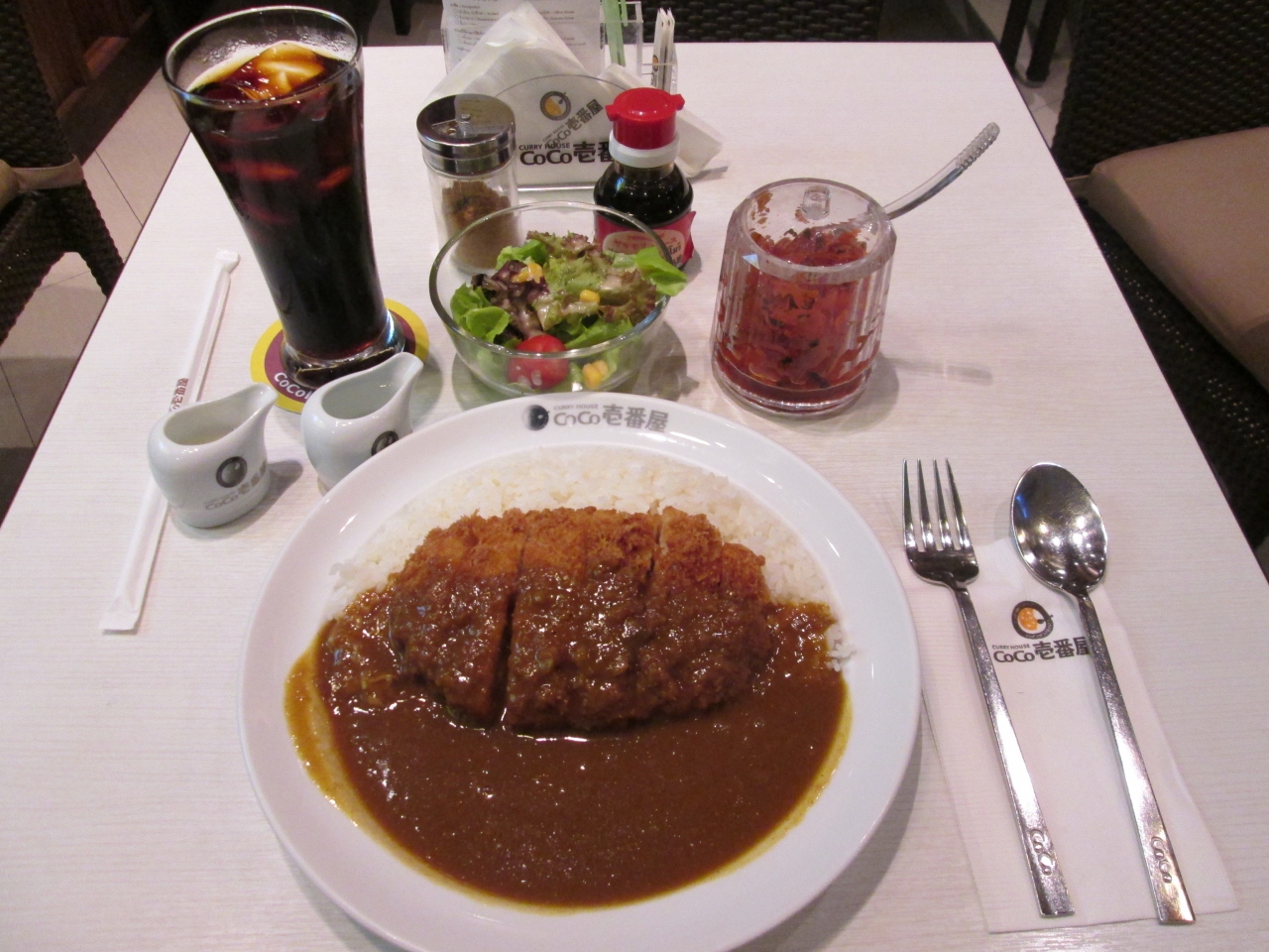 日本でおなじみのカレー屋さんでバンコクにもいくつかチェーン店があります。ポークカツカレー160バーツにミニサラダとドリンクが付くセット50バーツを食べました。リーズナブルな価格設定で日本で食べる味と変わらないのが良いです。