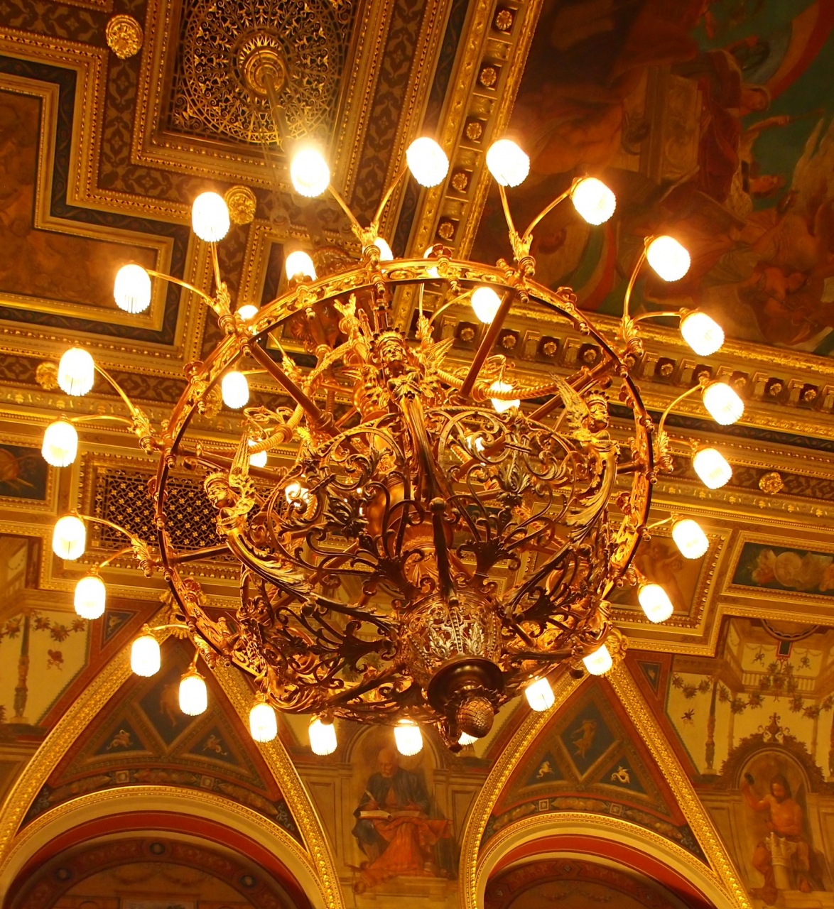 高い天井は、金ぴかの装飾で飾られ、美しいシャンデリア、壁の鏡など、まるで宮殿の一室のようです。