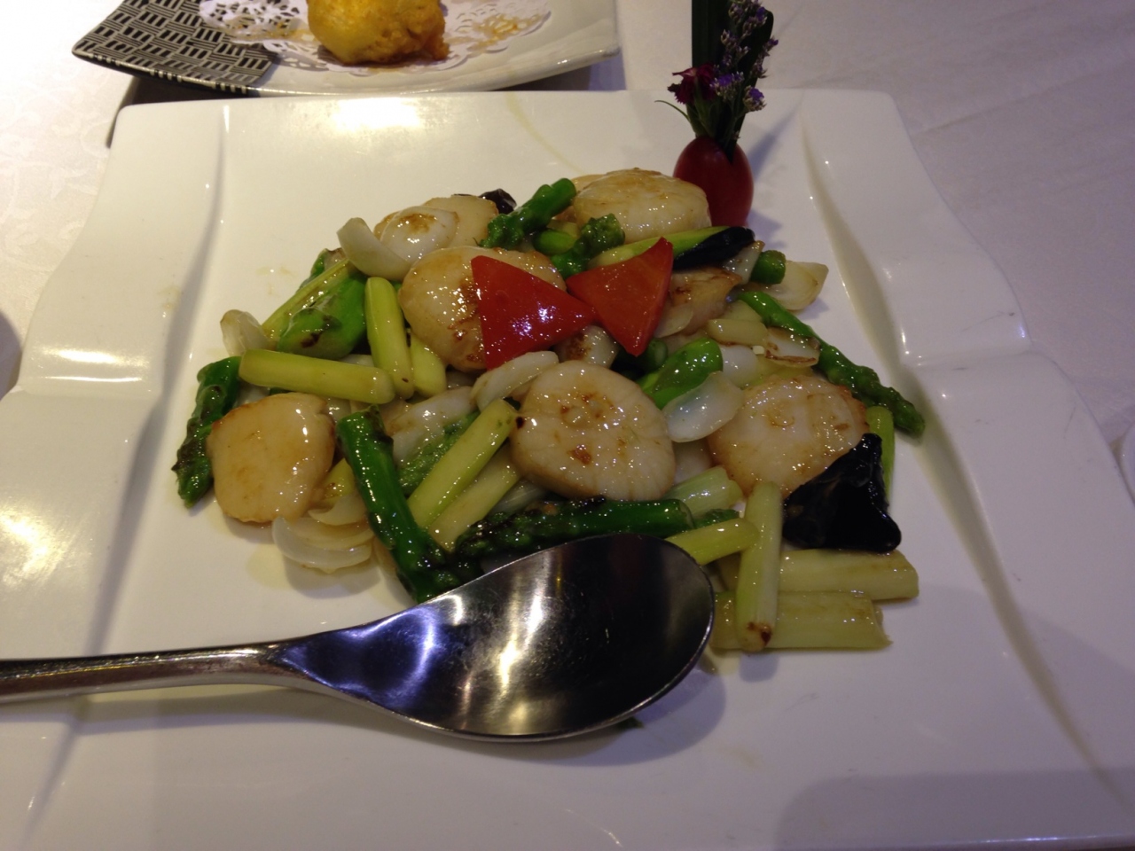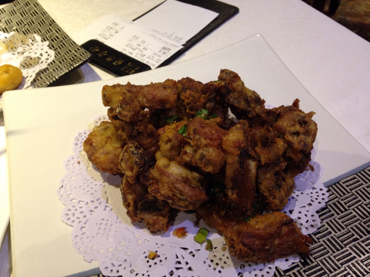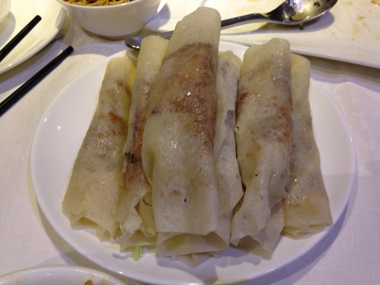 写真付きのメニューなので分かりやすいです。前菜のなすのフリッター。北京ダック半羽(78元=およそ1300円)、海鮮入りの豆腐スープ、ユリ根とホタテの炒め物、担担麺を頼みました。どれも美味しかったですが、北京ダックはちょっと残念でした。というのもお店の人が包んでくれるのですが、そのせいで全部冷めてしまって油っこく感じたからです。ただお肉を食べた後の骨の部分や、骨についた残りのお肉を「鴨二吃」という言い方で別の料理にしてくれます(有料35元)。お店の人のお勧めで塩コショウ炒めにしたら味は濃かったけどかなり美味しくて満足でした。